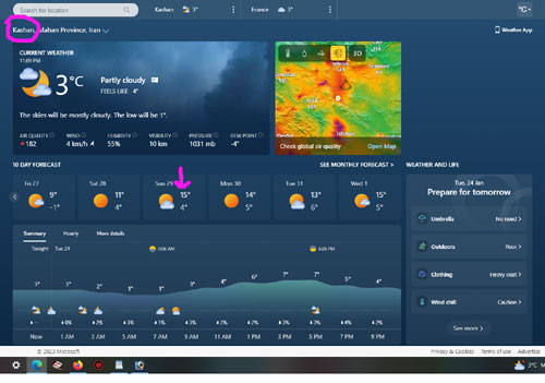 من فعلا برا اینکه امتحان کنم سم اثر کرده یا نه ، الکی یه چیزی توی باغچه میکارم که ببینم ریشه هاش غده ای میشن یا نه. ولی اینو بدونید وقتی سمپاشی میکنید تا دو سه ماه نمیتونید از خاک اون باغچه استفاده کنید و توش چیزی بکارید. راستی یه چیز دیگه هم اینکه درختاتون اگه قوی باشن در برابر افت نماتد مقاوم هستن. منم درختای بادوومم و گل محمد قوی هستن رد برابرش ولی سبزیجات و صیفی جاتی که کاشته بشه اصلا مقاوم نیستن . آب و هوای کاشون رو بخوام براتون بگم چطوریه الان، این عکس رو ببینید اون که با صورتی علامت زدم حداکثر دمای کاشون هس که به 15 درجه هم میرسه. این هوای هفته ی اینده ی کاشون هس. که به خاط رهمینه که کاشون توی اوایل بهمن ماه درختایی مث بادووم شکوفه میدن.یعنی بهار کاشون از اواسط بهمن شروع میشه. بازم میگم که این برنامه توی ویندوز 10 هس و میتونیدازش استفاده کنید خودش منطقه شما رو نشون میده. نیاز به پیدا کردن نیس. من همچنان روکش روی گلدونام میندازم