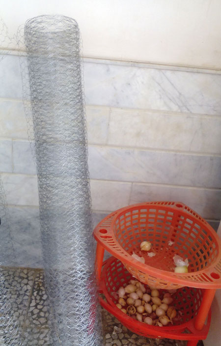 و چیزایی که الان خریدم برا کار باغبانی . تور سیمی و گونی کود هس. دوتا گونی پشگل که 90 تومن پولش شد. قیمت یه فلش تور سیمی هم 5 متر خریدم و یه دو متر .اونم که بغلش هس دیگه طبقه پیاز بود حال نداشتم بردارم عکس بگیرم