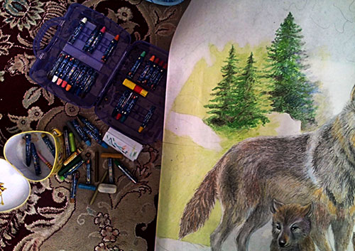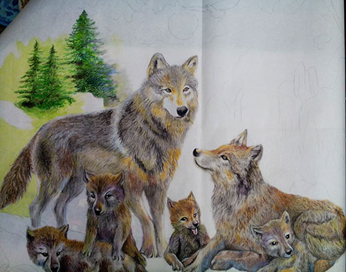 نقاشیمم که تا اینجا پیش رفته. خیلی کند پیش میره چون خیلی بزرگه خیلی هم رنگای زیادی داره. چند نوع سبز و یعنی از هر رنگی چندین رنگ کم رنگ و پررنگ باید استفاده کرد
