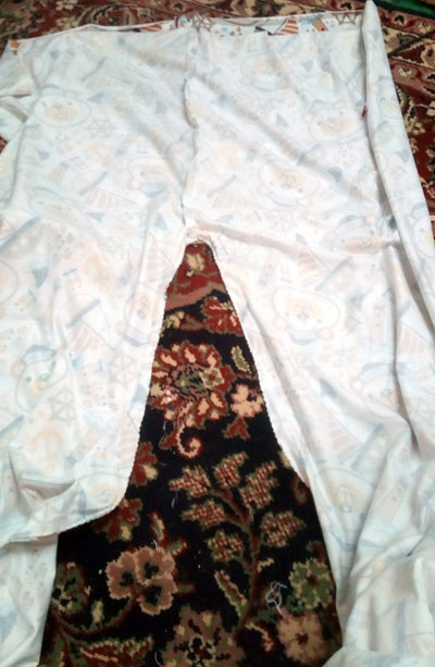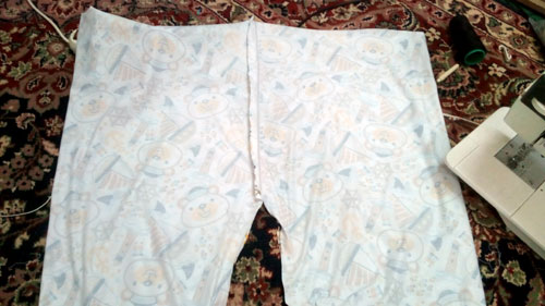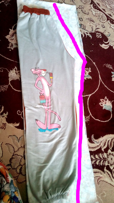 بعد طبق همون شلوار برش میزنید ولی من چون میخوام خیلی آزاد باشه بالاشو نمیزنم کلا خودتون دیگه هر جور دوس داشتید برش بزنید ولی اگه باز اولتون هس طبق همون شلوار برش بزنید و اینکه فاق شلوار رو هیچ وقت کوتا نبرید اگه از بالا تا فاق رو بلند ببرید میشه درستش کرد ولی اگه کوتاه ببرید شلوار رو خراب کردید. پس همیشه بلند برش بزنید. اینطوری هم که خط کشیدم میتونید برش بزنید عین خود شلوار. فقط اینو در نظر بگیرید که داخل شلوار کش هس و جمع شده باید بزرگتر ببرید. بعد پارچه رو یه لاشو باز میکنید دو طرف شلوار رو میدوزید چرخ خیاطی رو اوردم اتاقم میزش رو حال نداشتم بیارم رو زمین گذاشتم